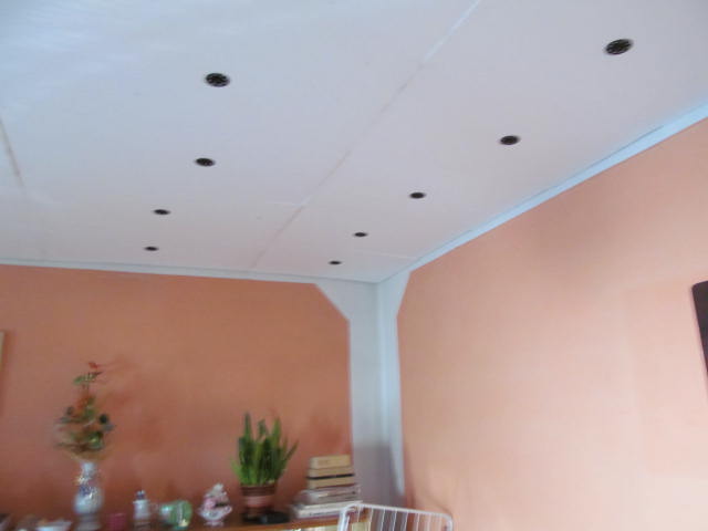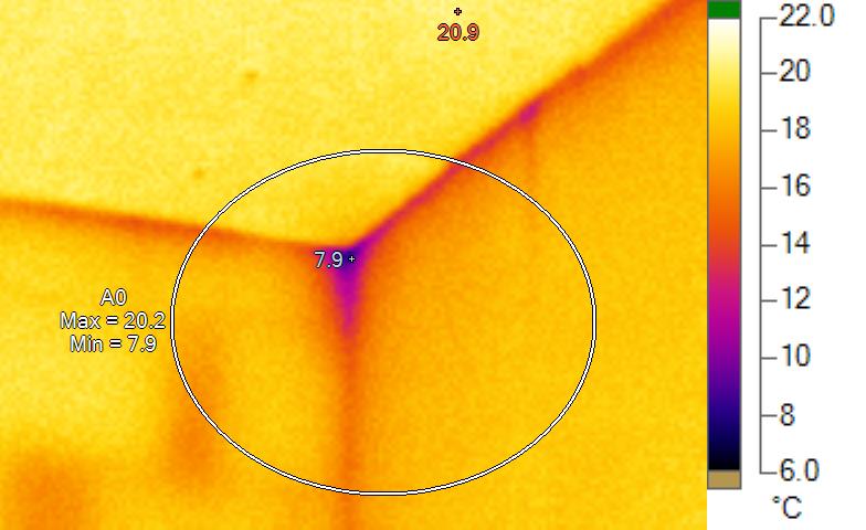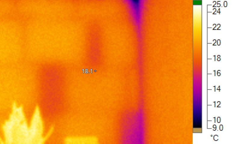 Mierny únik tepla v hornom rohu. V tejto miestnosti je zateplený strop. Na snímke vidíme vykreslené časti stavebného materiálu – kvadrov a spojiva, ktoré majú rôznu tepelnú priepustnosť.